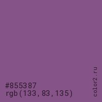 Цвет #855387 в цветовой модели RGB обозначается тремя октетами (133, 83, 135) в десятичном формате и #855387 в шестнадцатиричном (hex) формате, которые являются интенсивностью красного 133 (hex 85), интенсивность зелёного 83 (hex 53) и интенсивность синего 135 (hex 87).