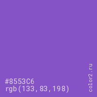 Цвет #8553C6 в цветовой модели RGB обозначается тремя октетами (133, 83, 198) в десятичном формате и #8553C6 в шестнадцатиричном (hex) формате, которые являются интенсивностью красного 133 (hex 85), интенсивность зелёного 83 (hex 53) и интенсивность синего 198 (hex C6).