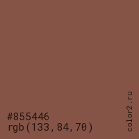 Цвет #855446 в цветовой модели RGB обозначается тремя октетами (133, 84, 70) в десятичном формате и #855446 в шестнадцатиричном (hex) формате, которые являются интенсивностью красного 133 (hex 85), интенсивность зелёного 84 (hex 54) и интенсивность синего 70 (hex 46).