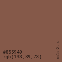 Цвет #855949 в цветовой модели RGB обозначается тремя октетами (133, 89, 73) в десятичном формате и #855949 в шестнадцатиричном (hex) формате, которые являются интенсивностью красного 133 (hex 85), интенсивность зелёного 89 (hex 59) и интенсивность синего 73 (hex 49).