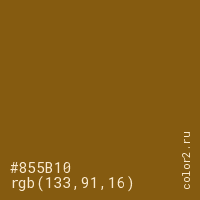 Цвет #855B10 в цветовой модели RGB обозначается тремя октетами (133, 91, 16) в десятичном формате и #855B10 в шестнадцатиричном (hex) формате, которые являются интенсивностью красного 133 (hex 85), интенсивность зелёного 91 (hex 5B) и интенсивность синего 16 (hex 10).