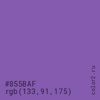 Цвет #855BAF в цветовой модели RGB обозначается тремя октетами (133, 91, 175) в десятичном формате и #855BAF в шестнадцатиричном (hex) формате, которые являются интенсивностью красного 133 (hex 85), интенсивность зелёного 91 (hex 5B) и интенсивность синего 175 (hex AF).