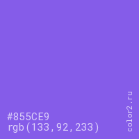 Цвет #855CE9 в цветовой модели RGB обозначается тремя октетами (133, 92, 233) в десятичном формате и #855CE9 в шестнадцатиричном (hex) формате, которые являются интенсивностью красного 133 (hex 85), интенсивность зелёного 92 (hex 5C) и интенсивность синего 233 (hex E9).