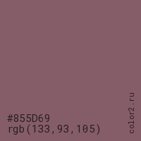 Цвет #855D69 в цветовой модели RGB обозначается тремя октетами (133, 93, 105) в десятичном формате и #855D69 в шестнадцатиричном (hex) формате, которые являются интенсивностью красного 133 (hex 85), интенсивность зелёного 93 (hex 5D) и интенсивность синего 105 (hex 69).