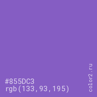 Цвет #855DC3 в цветовой модели RGB обозначается тремя октетами (133, 93, 195) в десятичном формате и #855DC3 в шестнадцатиричном (hex) формате, которые являются интенсивностью красного 133 (hex 85), интенсивность зелёного 93 (hex 5D) и интенсивность синего 195 (hex C3).
