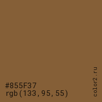 Цвет #855F37 в цветовой модели RGB обозначается тремя октетами (133, 95, 55) в десятичном формате и #855F37 в шестнадцатиричном (hex) формате, которые являются интенсивностью красного 133 (hex 85), интенсивность зелёного 95 (hex 5F) и интенсивность синего 55 (hex 37).