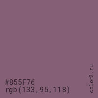 Цвет #855F76 в цветовой модели RGB обозначается тремя октетами (133, 95, 118) в десятичном формате и #855F76 в шестнадцатиричном (hex) формате, которые являются интенсивностью красного 133 (hex 85), интенсивность зелёного 95 (hex 5F) и интенсивность синего 118 (hex 76).