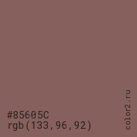 Цвет #85605C в цветовой модели RGB обозначается тремя октетами (133, 96, 92) в десятичном формате и #85605C в шестнадцатиричном (hex) формате, которые являются интенсивностью красного 133 (hex 85), интенсивность зелёного 96 (hex 60) и интенсивность синего 92 (hex 5C).