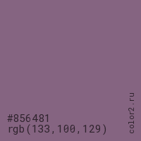 Цвет #856481 в цветовой модели RGB обозначается тремя октетами (133, 100, 129) в десятичном формате и #856481 в шестнадцатиричном (hex) формате, которые являются интенсивностью красного 133 (hex 85), интенсивность зелёного 100 (hex 64) и интенсивность синего 129 (hex 81).
