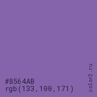 Цвет #8564AB в цветовой модели RGB обозначается тремя октетами (133, 100, 171) в десятичном формате и #8564AB в шестнадцатиричном (hex) формате, которые являются интенсивностью красного 133 (hex 85), интенсивность зелёного 100 (hex 64) и интенсивность синего 171 (hex AB).