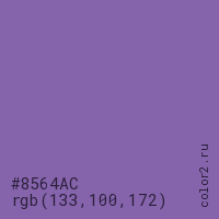 Цвет #8564AC в цветовой модели RGB обозначается тремя октетами (133, 100, 172) в десятичном формате и #8564AC в шестнадцатиричном (hex) формате, которые являются интенсивностью красного 133 (hex 85), интенсивность зелёного 100 (hex 64) и интенсивность синего 172 (hex AC).