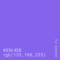 Цвет #8564EB в цветовой модели RGB обозначается тремя октетами (133, 100, 235) в десятичном формате и #8564EB в шестнадцатиричном (hex) формате, которые являются интенсивностью красного 133 (hex 85), интенсивность зелёного 100 (hex 64) и интенсивность синего 235 (hex EB).