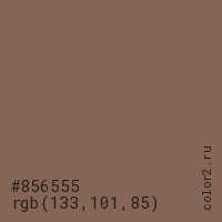 Цвет #856555 в цветовой модели RGB обозначается тремя октетами (133, 101, 85) в десятичном формате и #856555 в шестнадцатиричном (hex) формате, которые являются интенсивностью красного 133 (hex 85), интенсивность зелёного 101 (hex 65) и интенсивность синего 85 (hex 55).