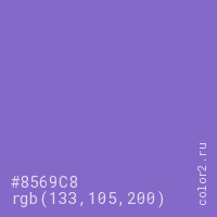 Цвет #8569C8 в цветовой модели RGB обозначается тремя октетами (133, 105, 200) в десятичном формате и #8569C8 в шестнадцатиричном (hex) формате, которые являются интенсивностью красного 133 (hex 85), интенсивность зелёного 105 (hex 69) и интенсивность синего 200 (hex C8).
