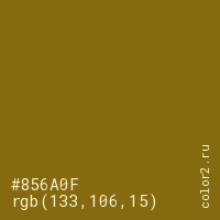 Цвет #856A0F в цветовой модели RGB обозначается тремя октетами (133, 106, 15) в десятичном формате и #856A0F в шестнадцатиричном (hex) формате, которые являются интенсивностью красного 133 (hex 85), интенсивность зелёного 106 (hex 6A) и интенсивность синего 15 (hex 0F).