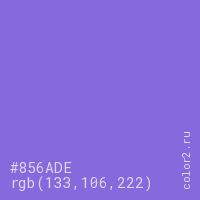 Цвет #856ADE в цветовой модели RGB обозначается тремя октетами (133, 106, 222) в десятичном формате и #856ADE в шестнадцатиричном (hex) формате, которые являются интенсивностью красного 133 (hex 85), интенсивность зелёного 106 (hex 6A) и интенсивность синего 222 (hex DE).