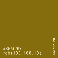 Цвет #856C0D в цветовой модели RGB обозначается тремя октетами (133, 108, 13) в десятичном формате и #856C0D в шестнадцатиричном (hex) формате, которые являются интенсивностью красного 133 (hex 85), интенсивность зелёного 108 (hex 6C) и интенсивность синего 13 (hex 0D).