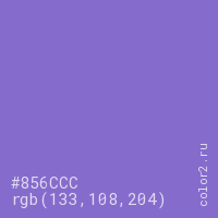 Цвет #856CCC в цветовой модели RGB обозначается тремя октетами (133, 108, 204) в десятичном формате и #856CCC в шестнадцатиричном (hex) формате, которые являются интенсивностью красного 133 (hex 85), интенсивность зелёного 108 (hex 6C) и интенсивность синего 204 (hex CC).