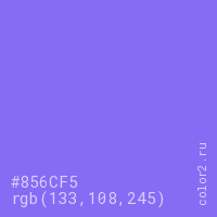 Цвет #856CF5 в цветовой модели RGB обозначается тремя октетами (133, 108, 245) в десятичном формате и #856CF5 в шестнадцатиричном (hex) формате, которые являются интенсивностью красного 133 (hex 85), интенсивность зелёного 108 (hex 6C) и интенсивность синего 245 (hex F5).