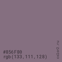 Цвет #856F80 в цветовой модели RGB обозначается тремя октетами (133, 111, 128) в десятичном формате и #856F80 в шестнадцатиричном (hex) формате, которые являются интенсивностью красного 133 (hex 85), интенсивность зелёного 111 (hex 6F) и интенсивность синего 128 (hex 80).