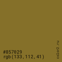 Цвет #857029 в цветовой модели RGB обозначается тремя октетами (133, 112, 41) в десятичном формате и #857029 в шестнадцатиричном (hex) формате, которые являются интенсивностью красного 133 (hex 85), интенсивность зелёного 112 (hex 70) и интенсивность синего 41 (hex 29).