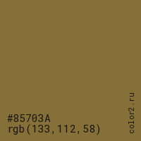 Цвет #85703A в цветовой модели RGB обозначается тремя октетами (133, 112, 58) в десятичном формате и #85703A в шестнадцатиричном (hex) формате, которые являются интенсивностью красного 133 (hex 85), интенсивность зелёного 112 (hex 70) и интенсивность синего 58 (hex 3A).
