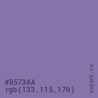 Цвет #8573AA в цветовой модели RGB обозначается тремя октетами (133, 115, 170) в десятичном формате и #8573AA в шестнадцатиричном (hex) формате, которые являются интенсивностью красного 133 (hex 85), интенсивность зелёного 115 (hex 73) и интенсивность синего 170 (hex AA).