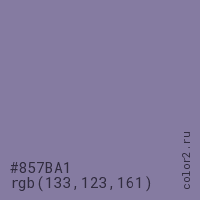 Цвет #857BA1 в цветовой модели RGB обозначается тремя октетами (133, 123, 161) в десятичном формате и #857BA1 в шестнадцатиричном (hex) формате, которые являются интенсивностью красного 133 (hex 85), интенсивность зелёного 123 (hex 7B) и интенсивность синего 161 (hex A1).