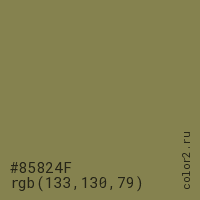 Цвет #85824F в цветовой модели RGB обозначается тремя октетами (133, 130, 79) в десятичном формате и #85824F в шестнадцатиричном (hex) формате, которые являются интенсивностью красного 133 (hex 85), интенсивность зелёного 130 (hex 82) и интенсивность синего 79 (hex 4F).