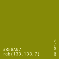 Цвет #858A07 в цветовой модели RGB обозначается тремя октетами (133, 138, 7) в десятичном формате и #858A07 в шестнадцатиричном (hex) формате, которые являются интенсивностью красного 133 (hex 85), интенсивность зелёного 138 (hex 8A) и интенсивность синего 7 (hex 07).