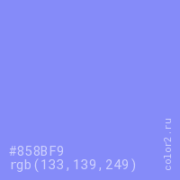 Цвет #858BF9 в цветовой модели RGB обозначается тремя октетами (133, 139, 249) в десятичном формате и #858BF9 в шестнадцатиричном (hex) формате, которые являются интенсивностью красного 133 (hex 85), интенсивность зелёного 139 (hex 8B) и интенсивность синего 249 (hex F9).