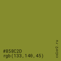 Цвет #858C2D в цветовой модели RGB обозначается тремя октетами (133, 140, 45) в десятичном формате и #858C2D в шестнадцатиричном (hex) формате, которые являются интенсивностью красного 133 (hex 85), интенсивность зелёного 140 (hex 8C) и интенсивность синего 45 (hex 2D).