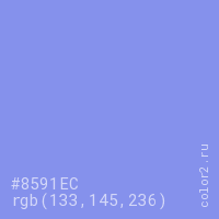 Цвет #8591EC в цветовой модели RGB обозначается тремя октетами (133, 145, 236) в десятичном формате и #8591EC в шестнадцатиричном (hex) формате, которые являются интенсивностью красного 133 (hex 85), интенсивность зелёного 145 (hex 91) и интенсивность синего 236 (hex EC).