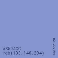 Цвет #8594CC в цветовой модели RGB обозначается тремя октетами (133, 148, 204) в десятичном формате и #8594CC в шестнадцатиричном (hex) формате, которые являются интенсивностью красного 133 (hex 85), интенсивность зелёного 148 (hex 94) и интенсивность синего 204 (hex CC).