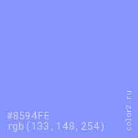 Цвет #8594FE в цветовой модели RGB обозначается тремя октетами (133, 148, 254) в десятичном формате и #8594FE в шестнадцатиричном (hex) формате, которые являются интенсивностью красного 133 (hex 85), интенсивность зелёного 148 (hex 94) и интенсивность синего 254 (hex FE).