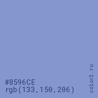 Цвет #8596CE в цветовой модели RGB обозначается тремя октетами (133, 150, 206) в десятичном формате и #8596CE в шестнадцатиричном (hex) формате, которые являются интенсивностью красного 133 (hex 85), интенсивность зелёного 150 (hex 96) и интенсивность синего 206 (hex CE).
