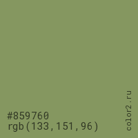 Цвет #859760 в цветовой модели RGB обозначается тремя октетами (133, 151, 96) в десятичном формате и #859760 в шестнадцатиричном (hex) формате, которые являются интенсивностью красного 133 (hex 85), интенсивность зелёного 151 (hex 97) и интенсивность синего 96 (hex 60).