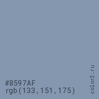 Цвет #8597AF в цветовой модели RGB обозначается тремя октетами (133, 151, 175) в десятичном формате и #8597AF в шестнадцатиричном (hex) формате, которые являются интенсивностью красного 133 (hex 85), интенсивность зелёного 151 (hex 97) и интенсивность синего 175 (hex AF).