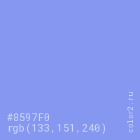 Цвет #8597F0 в цветовой модели RGB обозначается тремя октетами (133, 151, 240) в десятичном формате и #8597F0 в шестнадцатиричном (hex) формате, которые являются интенсивностью красного 133 (hex 85), интенсивность зелёного 151 (hex 97) и интенсивность синего 240 (hex F0).