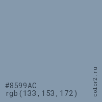 Цвет #8599AC в цветовой модели RGB обозначается тремя октетами (133, 153, 172) в десятичном формате и #8599AC в шестнадцатиричном (hex) формате, которые являются интенсивностью красного 133 (hex 85), интенсивность зелёного 153 (hex 99) и интенсивность синего 172 (hex AC).
