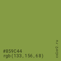 Цвет #859C44 в цветовой модели RGB обозначается тремя октетами (133, 156, 68) в десятичном формате и #859C44 в шестнадцатиричном (hex) формате, которые являются интенсивностью красного 133 (hex 85), интенсивность зелёного 156 (hex 9C) и интенсивность синего 68 (hex 44).