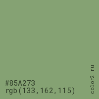 Цвет #85A273 в цветовой модели RGB обозначается тремя октетами (133, 162, 115) в десятичном формате и #85A273 в шестнадцатиричном (hex) формате, которые являются интенсивностью красного 133 (hex 85), интенсивность зелёного 162 (hex A2) и интенсивность синего 115 (hex 73).