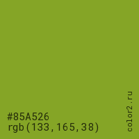 Цвет #85A526 в цветовой модели RGB обозначается тремя октетами (133, 165, 38) в десятичном формате и #85A526 в шестнадцатиричном (hex) формате, которые являются интенсивностью красного 133 (hex 85), интенсивность зелёного 165 (hex A5) и интенсивность синего 38 (hex 26).