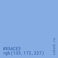 Цвет #85ACE3 в цветовой модели RGB обозначается тремя октетами (133, 172, 227) в десятичном формате и #85ACE3 в шестнадцатиричном (hex) формате, которые являются интенсивностью красного 133 (hex 85), интенсивность зелёного 172 (hex AC) и интенсивность синего 227 (hex E3).