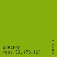 Цвет #85AF0C в цветовой модели RGB обозначается тремя октетами (133, 175, 12) в десятичном формате и #85AF0C в шестнадцатиричном (hex) формате, которые являются интенсивностью красного 133 (hex 85), интенсивность зелёного 175 (hex AF) и интенсивность синего 12 (hex 0C).