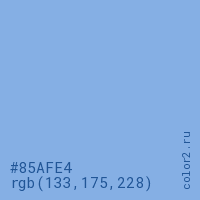 Цвет #85AFE4 в цветовой модели RGB обозначается тремя октетами (133, 175, 228) в десятичном формате и #85AFE4 в шестнадцатиричном (hex) формате, которые являются интенсивностью красного 133 (hex 85), интенсивность зелёного 175 (hex AF) и интенсивность синего 228 (hex E4).