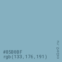 Цвет #85B0BF в цветовой модели RGB обозначается тремя октетами (133, 176, 191) в десятичном формате и #85B0BF в шестнадцатиричном (hex) формате, которые являются интенсивностью красного 133 (hex 85), интенсивность зелёного 176 (hex B0) и интенсивность синего 191 (hex BF).