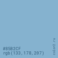 Цвет #85B2CF в цветовой модели RGB обозначается тремя октетами (133, 178, 207) в десятичном формате и #85B2CF в шестнадцатиричном (hex) формате, которые являются интенсивностью красного 133 (hex 85), интенсивность зелёного 178 (hex B2) и интенсивность синего 207 (hex CF).