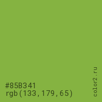 Цвет #85B341 в цветовой модели RGB обозначается тремя октетами (133, 179, 65) в десятичном формате и #85B341 в шестнадцатиричном (hex) формате, которые являются интенсивностью красного 133 (hex 85), интенсивность зелёного 179 (hex B3) и интенсивность синего 65 (hex 41).
