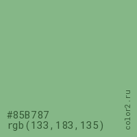 Цвет #85B787 в цветовой модели RGB обозначается тремя октетами (133, 183, 135) в десятичном формате и #85B787 в шестнадцатиричном (hex) формате, которые являются интенсивностью красного 133 (hex 85), интенсивность зелёного 183 (hex B7) и интенсивность синего 135 (hex 87).